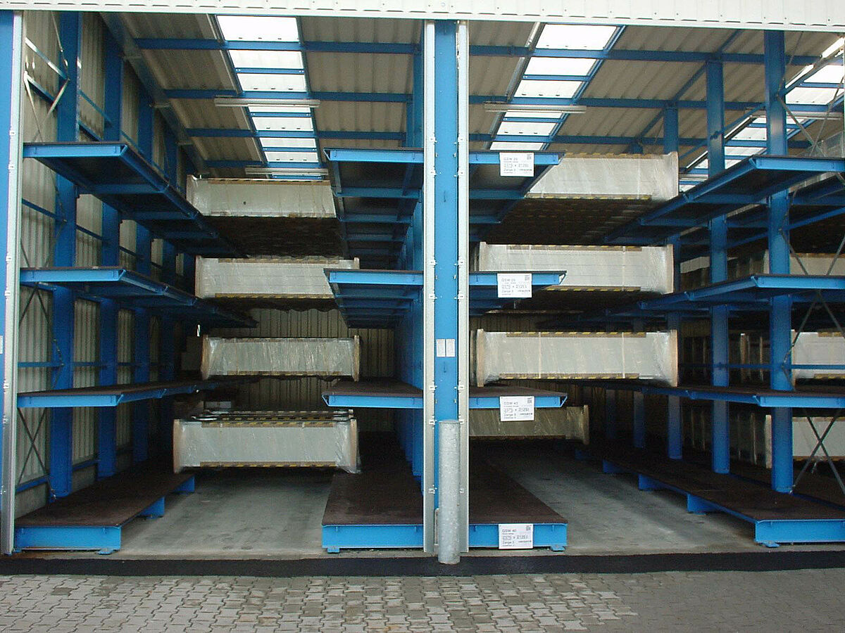 Při tom slouží patra konzolového regálu ve své hloubce jako úložný prostor. Vrata mohou být uložena v jednotlivých patrech a jsou skladována při optimálním využití plochy. Jen několika málo zdvihy vysokozdvižného vozíku může být vyskladněna celá šachta a naložena do kamionu.
